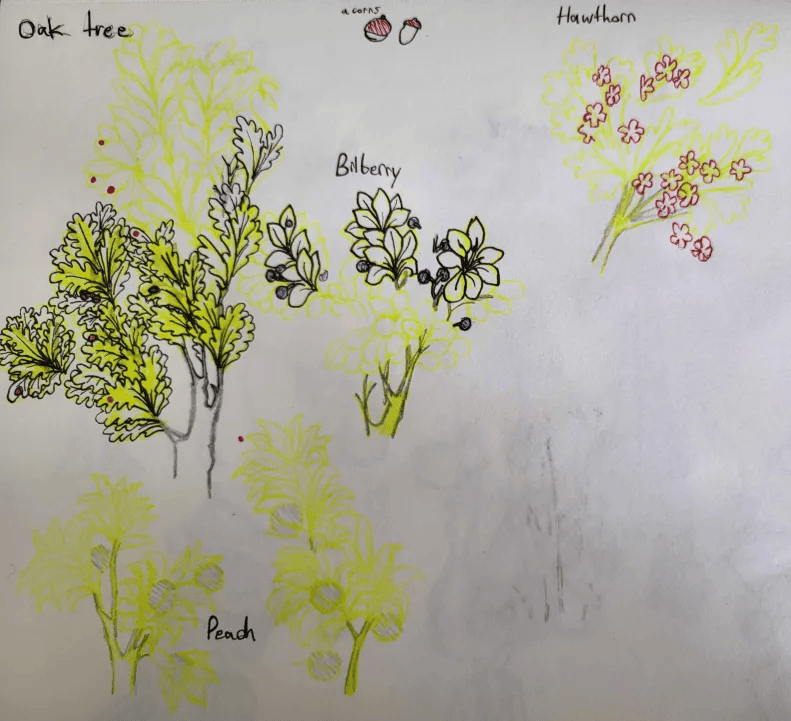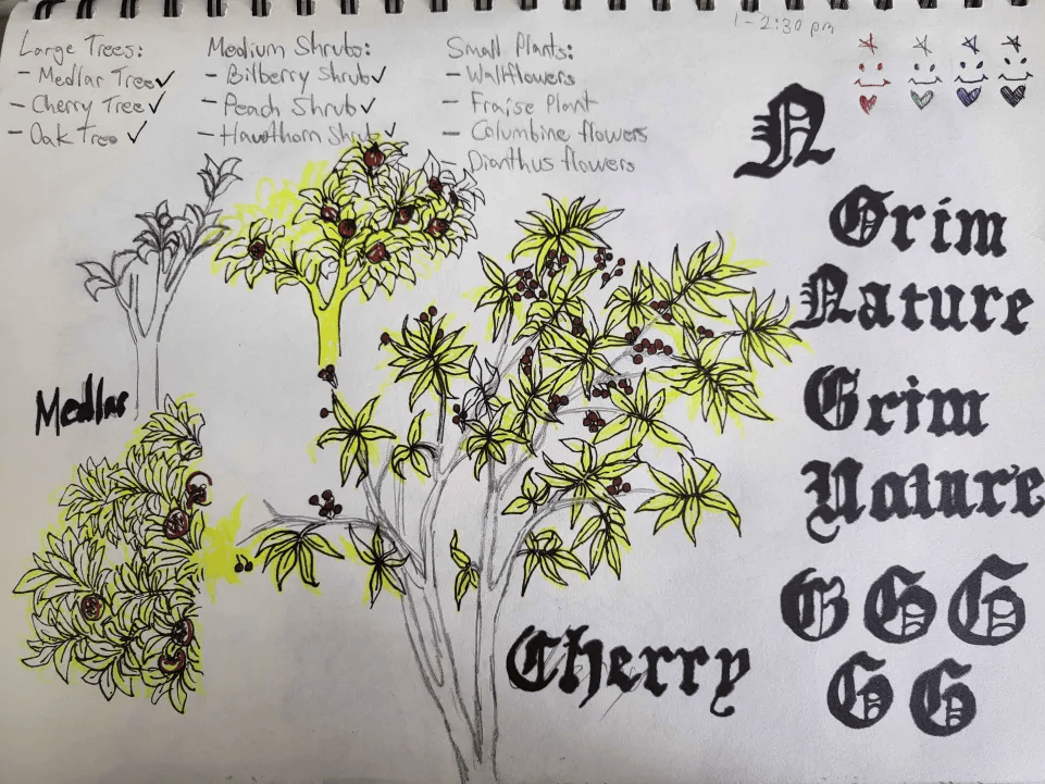I have been working on the Dragonfly FX and planning the branch structure and fruits, nuts and flowers placement in my trees and shrubs. I was also exploring the calligraphy that I will use for the title of the game.